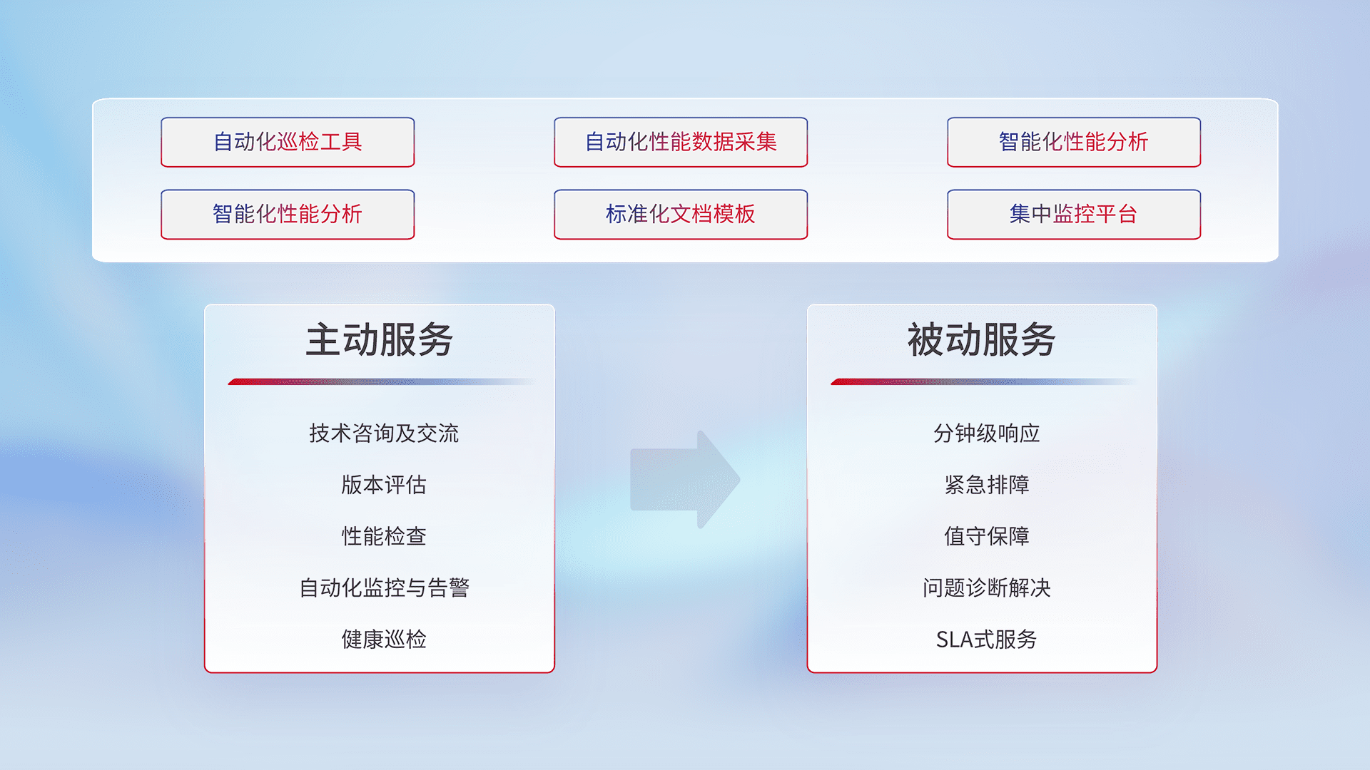 智能化工具和标准化文档,,保障服务质量,,,提供主动服务(包含技术咨询、、版本评估、、、、性能检查、、自动化监控与告警、、、、健康巡检)和被动服务包含(分钟级响应、、紧急排障、、、、值守保障、、、、问题诊断解决、、SLA服务)。。。。