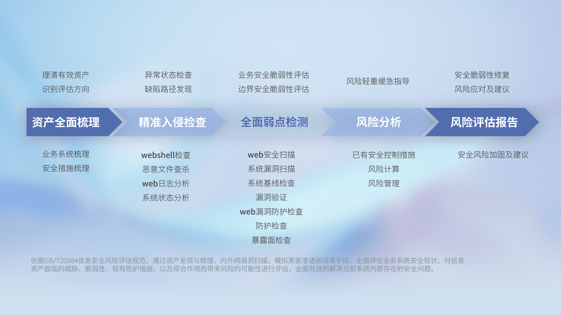 针对客户行业特性,,,以专业的安全服务+多厂商联合解决方案提供专属的一站式安全管理服务,,,,帮助客户全面感知网络空间威胁,,,基于识别、、、检测、、分析、、、防护、、、、监测、、、、响应的服务理论模型,,,,从方案咨询、、集成交付、、、评估验证、、优化加固、、、、运维运营,,,,致力于为客户提供完整的闭环管理式安全服务。。。。以实战经验为客户打造高抵御风险的安全体系,,,帮助客户发现威胁、、、、对抗威胁、、处置威胁,,,,不断积累安全对抗能力,,,,持续保障数字化安全。。。