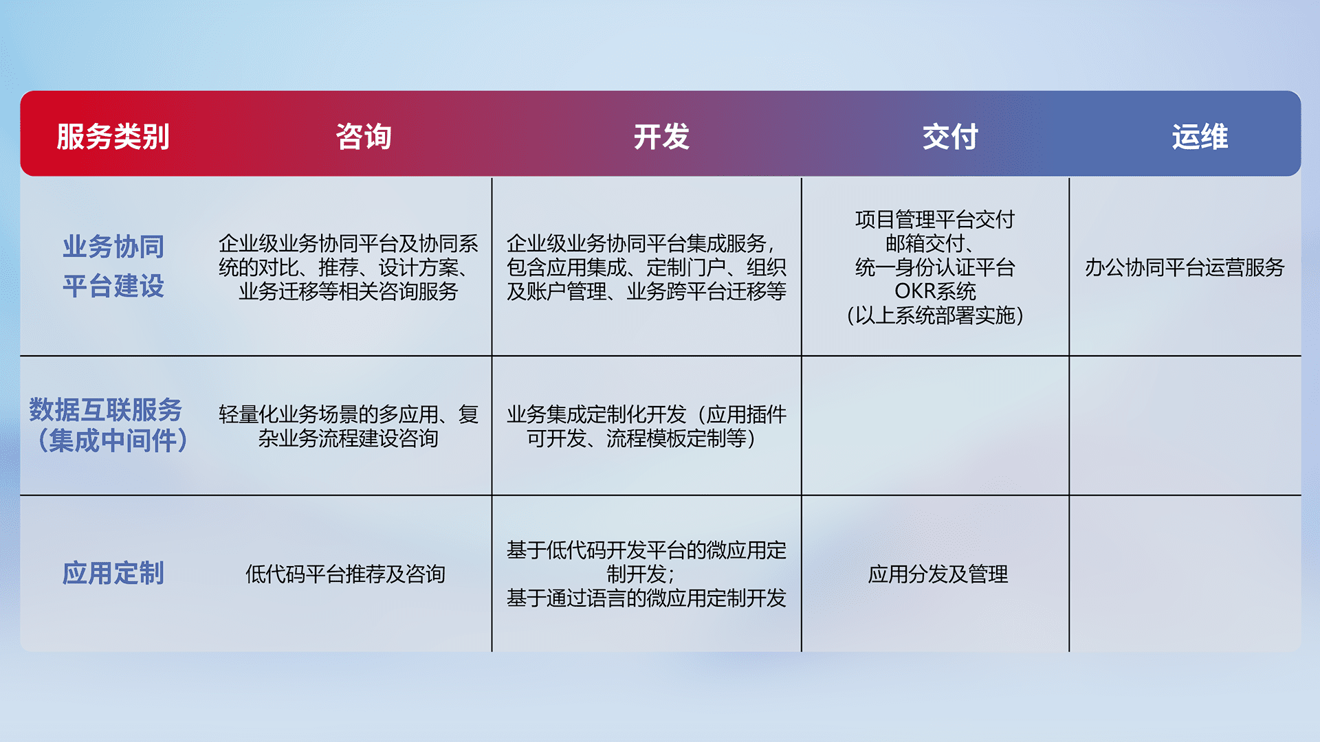 针对钉钉、、企微、、IDaas等平台级产品提供产品的规划、、、方案、、、交付、、、、定制化开发等服务,,实现如统一协同办公、、、智能客户服务、、、混合会议管理、、智能数据查询、、、等业务场景,,,实现数字化转型。。。